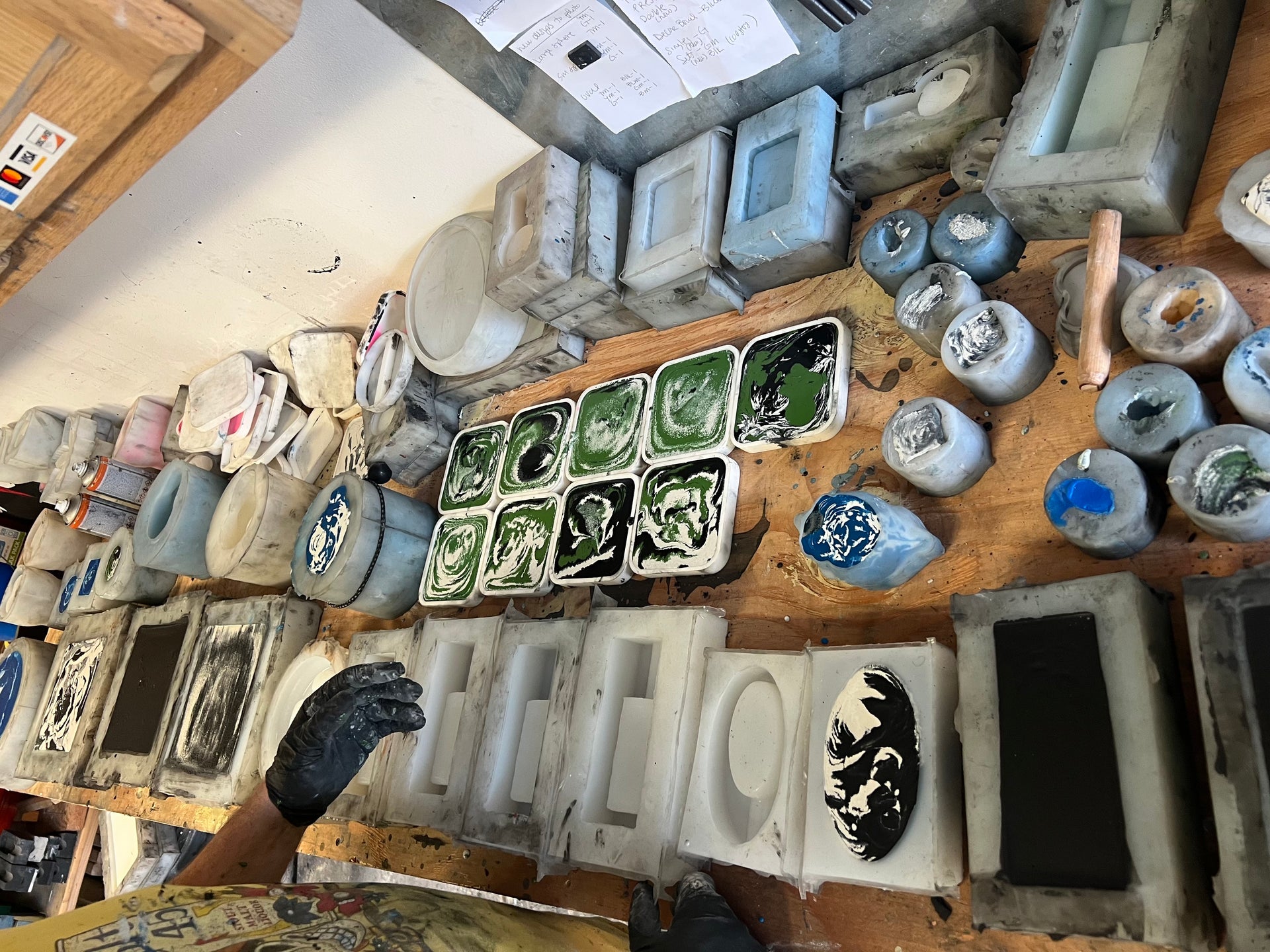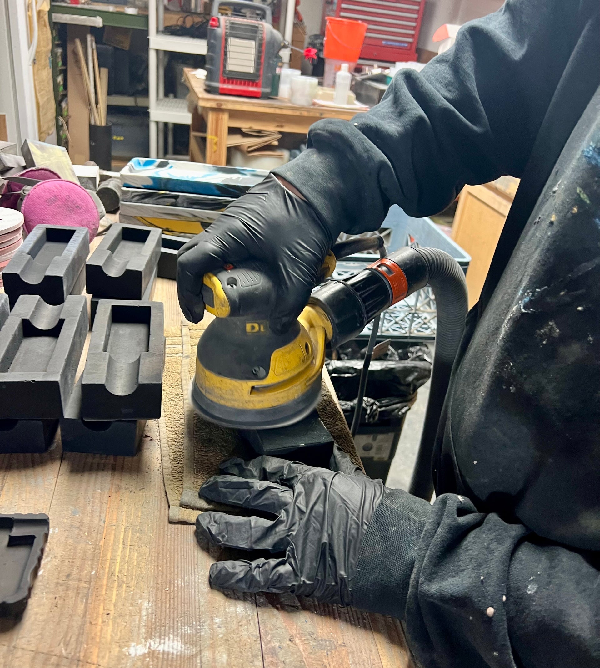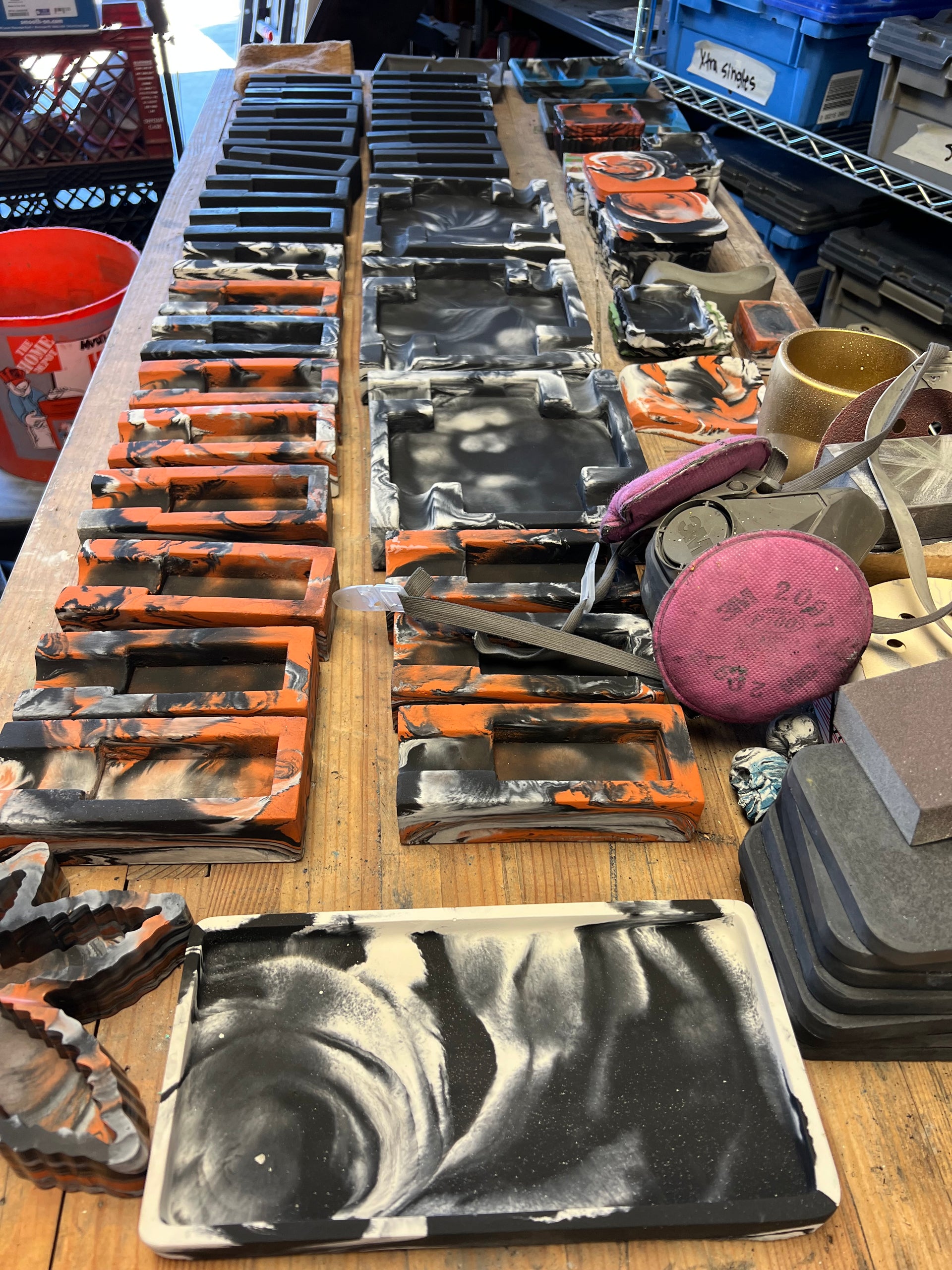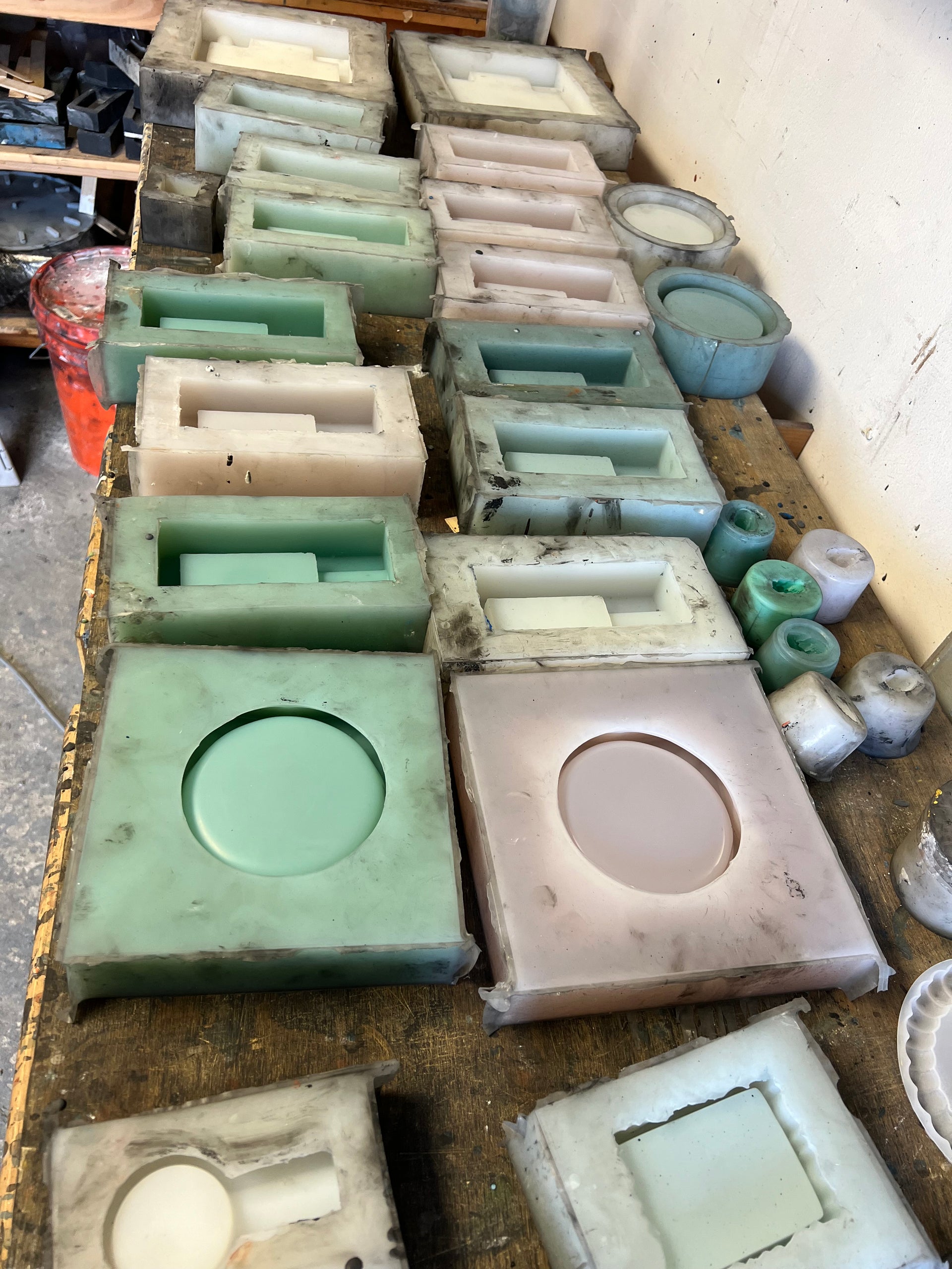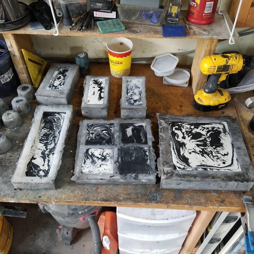 Here’s a peek into our garage studio, where all the concrete magic happens! What sets us apart is that we design and create our own molds, so you won’t find our unique pieces anywhere else. Be sure to follow us on social media to see our creative process and all the cool things we make!