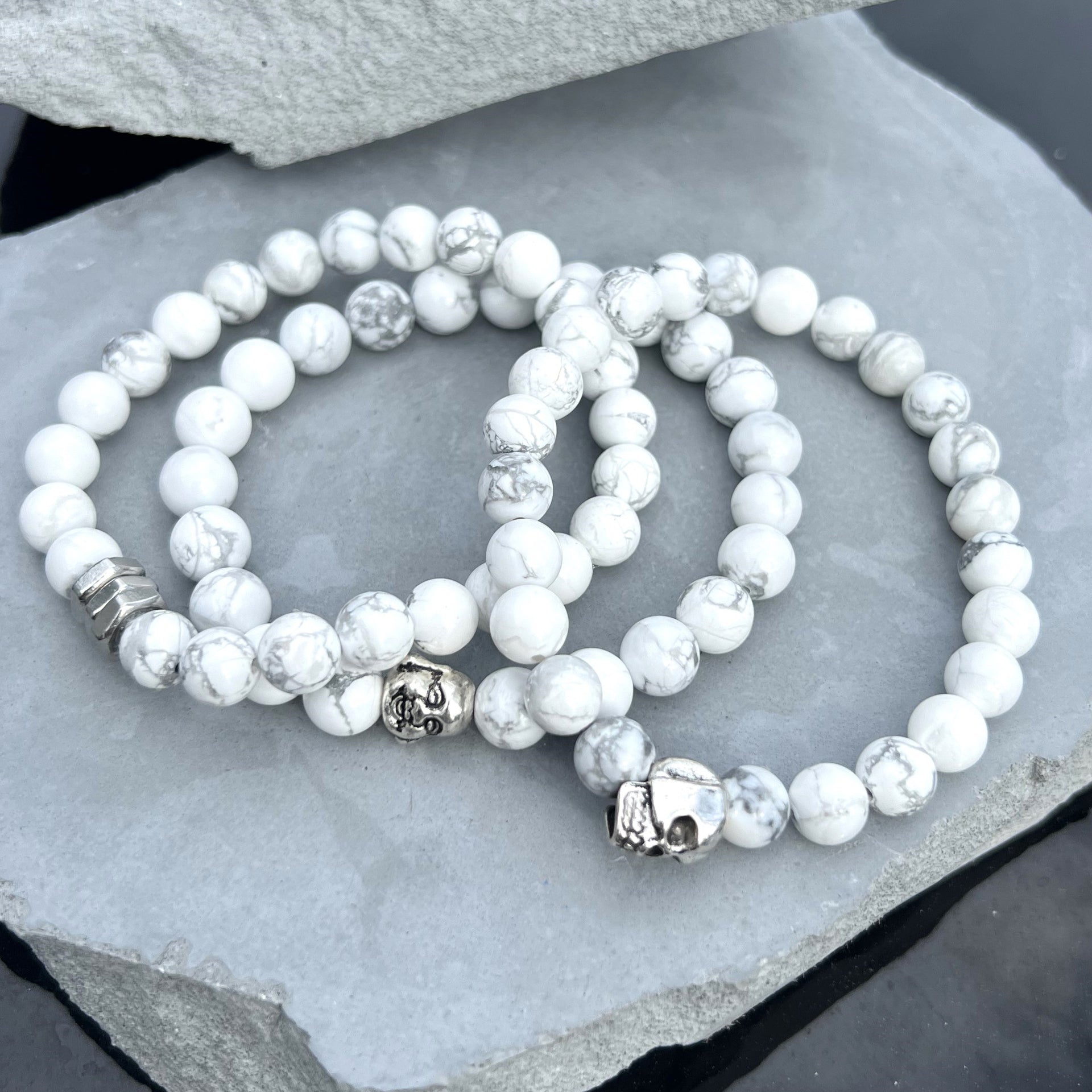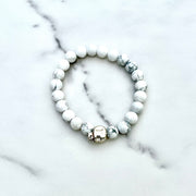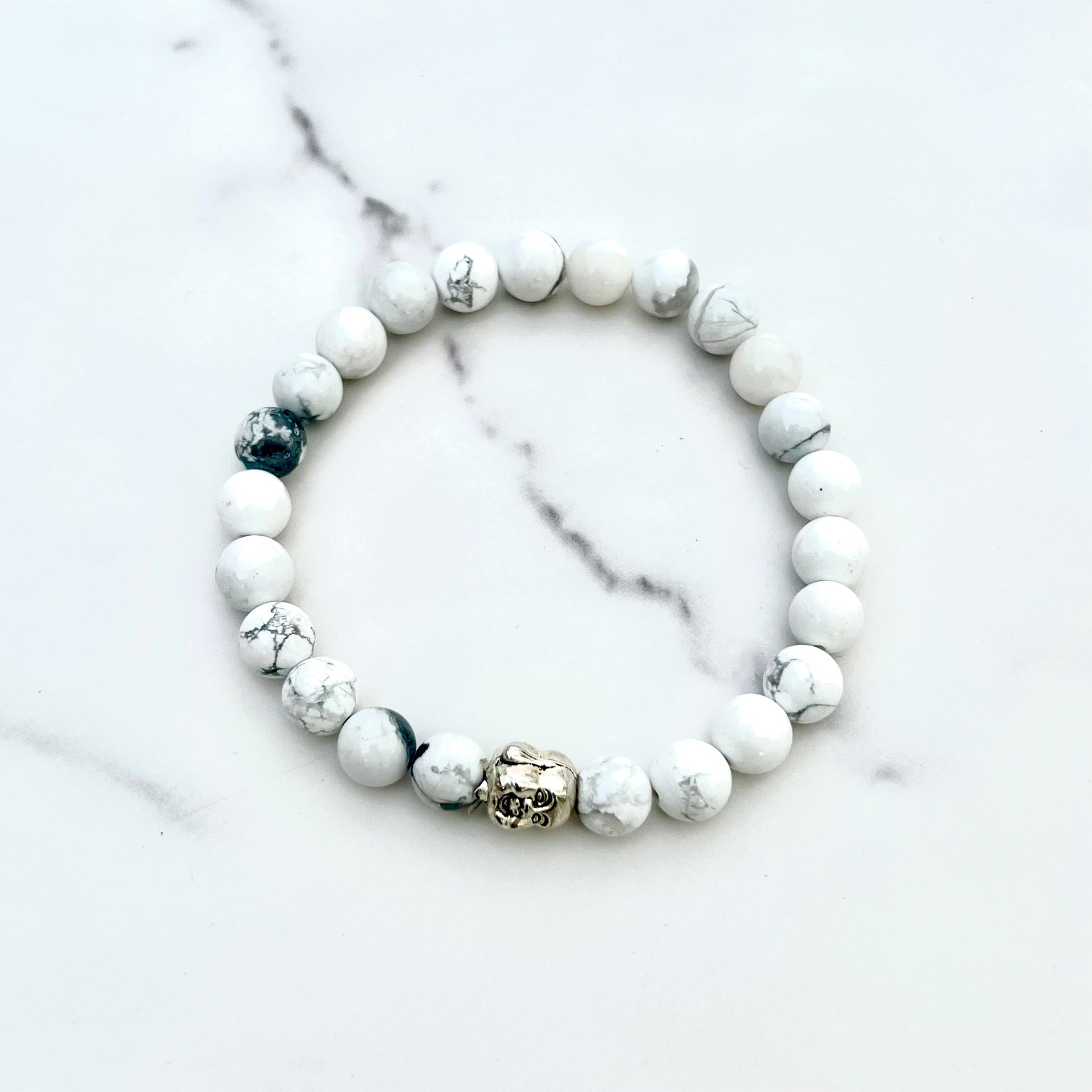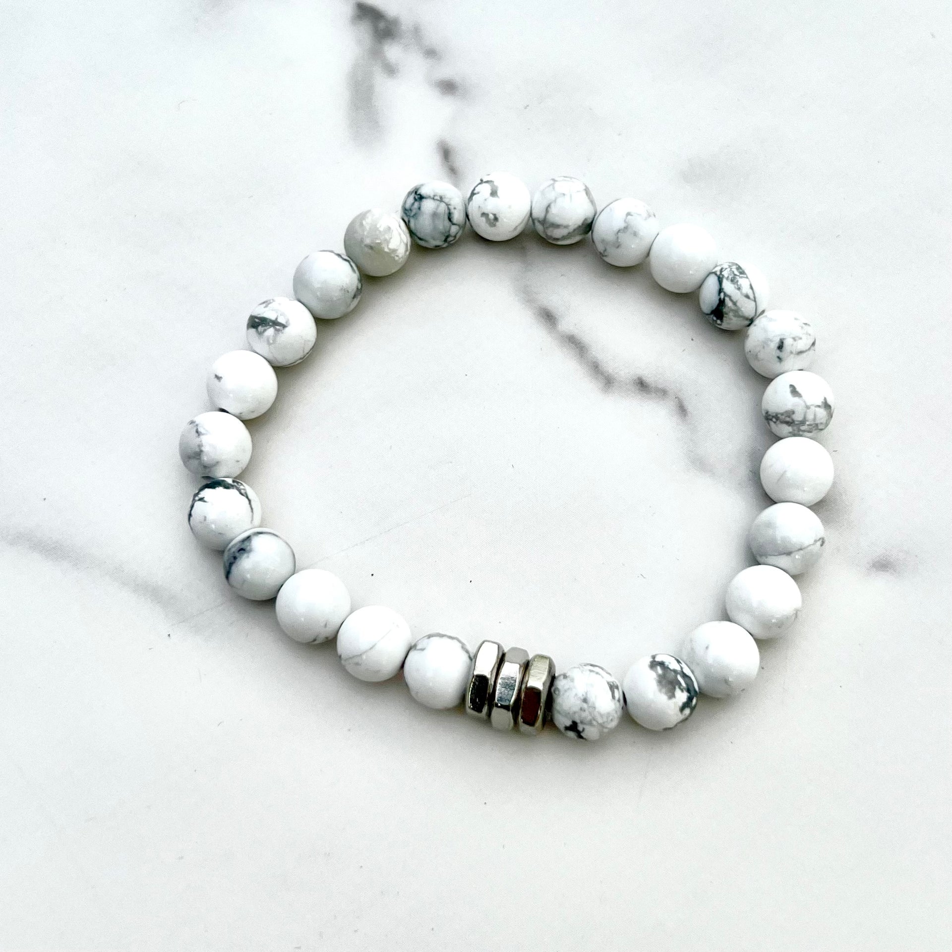 Hand-strung in small batches, our Howlite Beaded Bracelet blends crisp elegance with calming energy—making it a go-to piece for everyday wear or seasonal styling. Its clean white tones, veined with soft grey striations, evoke a sense of effortless serenity and pair beautifully with sun-kissed skin in the warmer months.