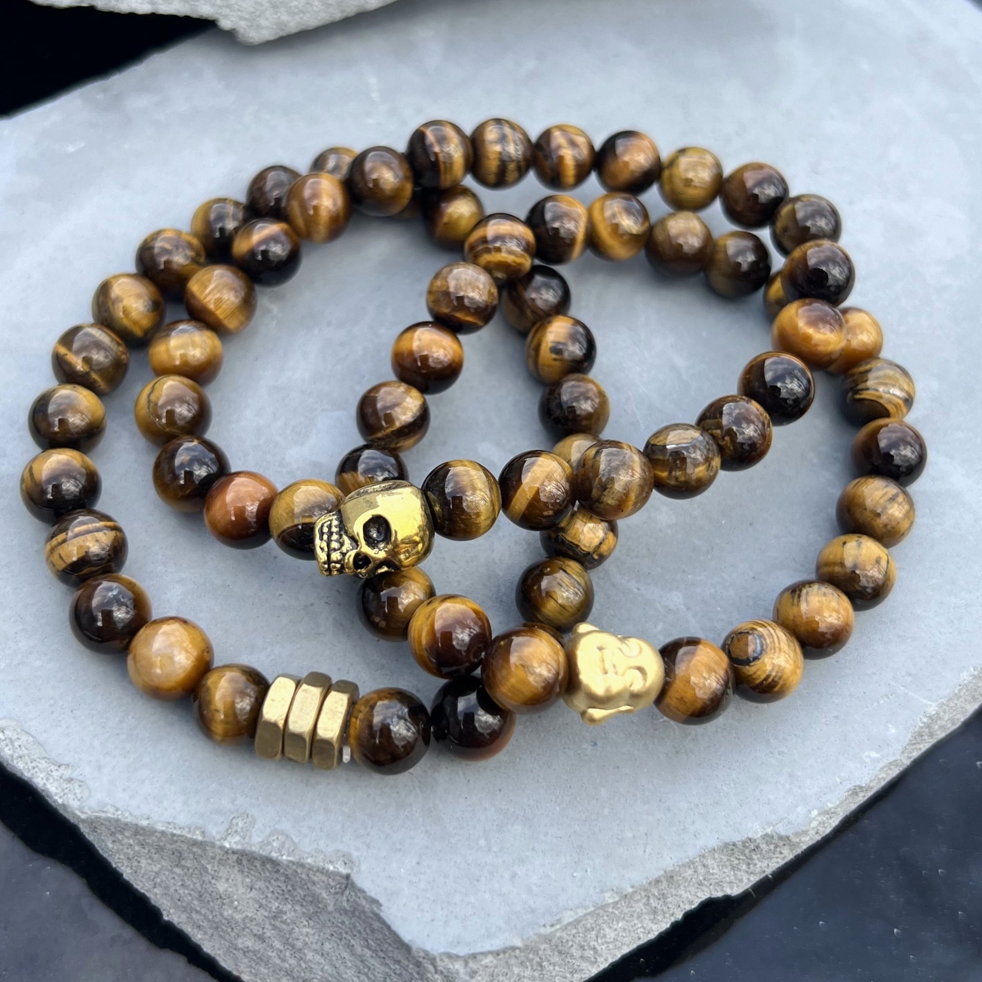 Choose your focal bead: gold hex nuts for a modern edge, a gold skull for boldness, or a gold Buddha for a calming, spiritual touch—allowing you to personalize your bracelet with intention and style.