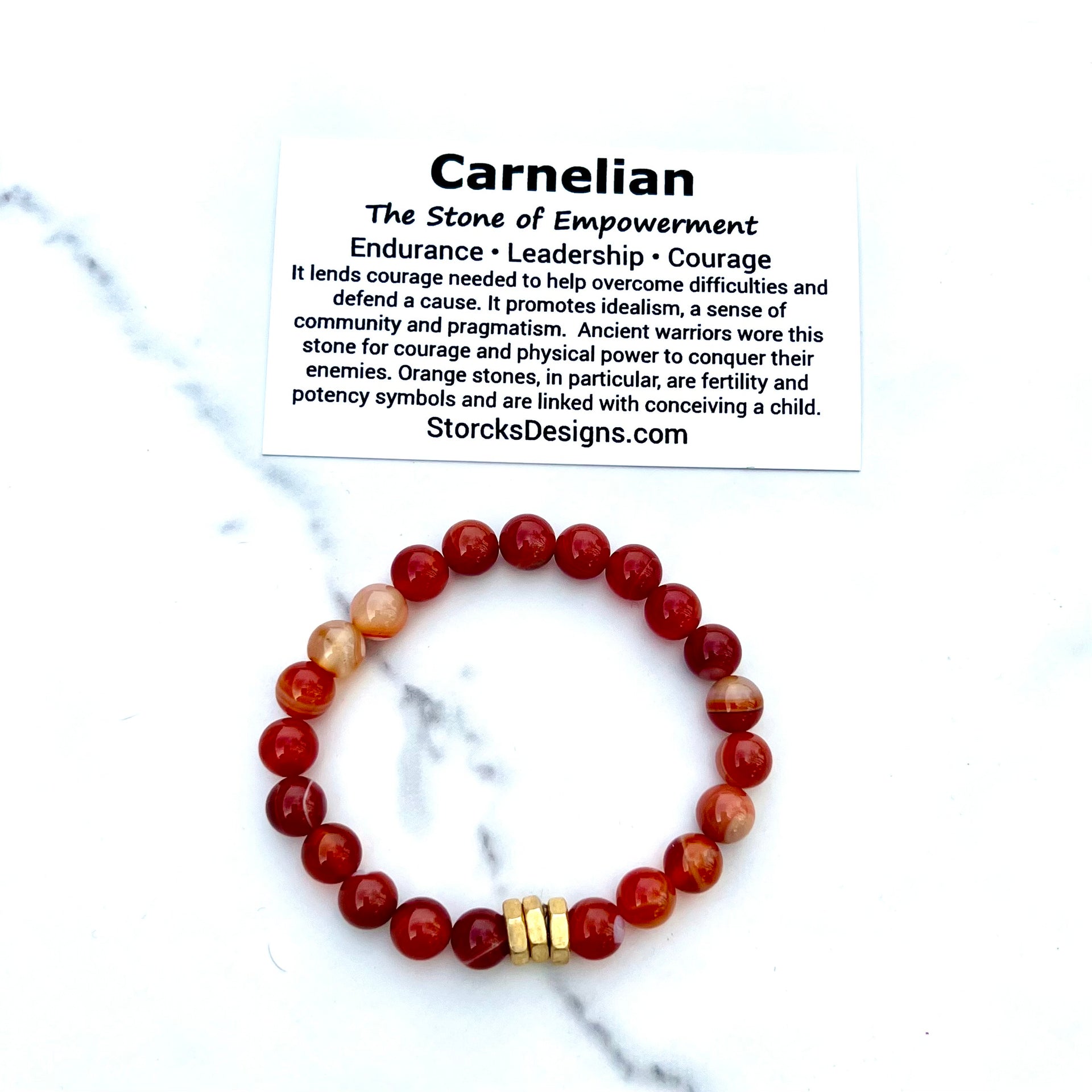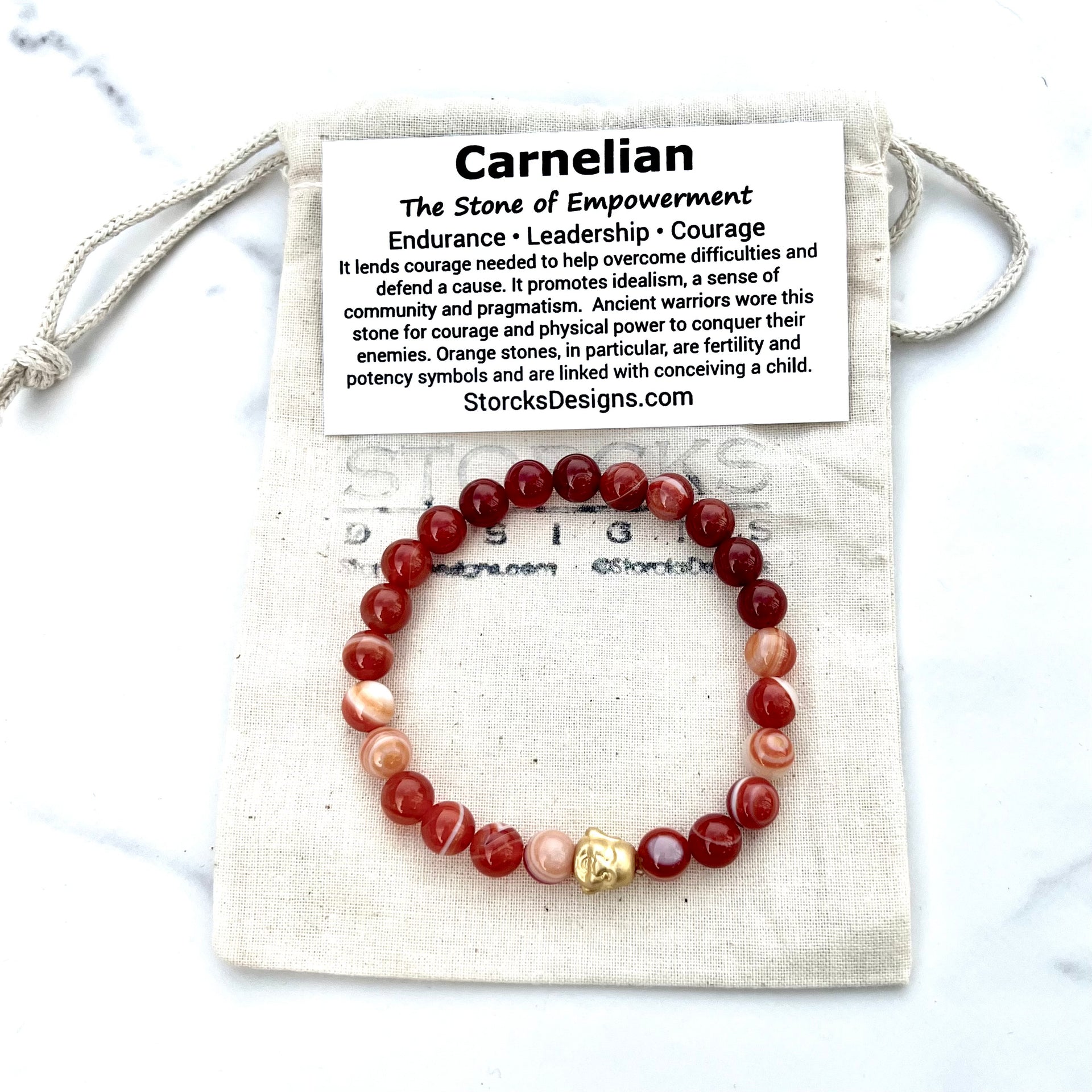 With your purchase, you’ll receive a printed card detailing the meaning and origins of Carnelian, adding depth to this striking accessory. Your bracelet arrives in our signature cotton drawstring bag, making it gift-ready or perfect for personal inspiration.