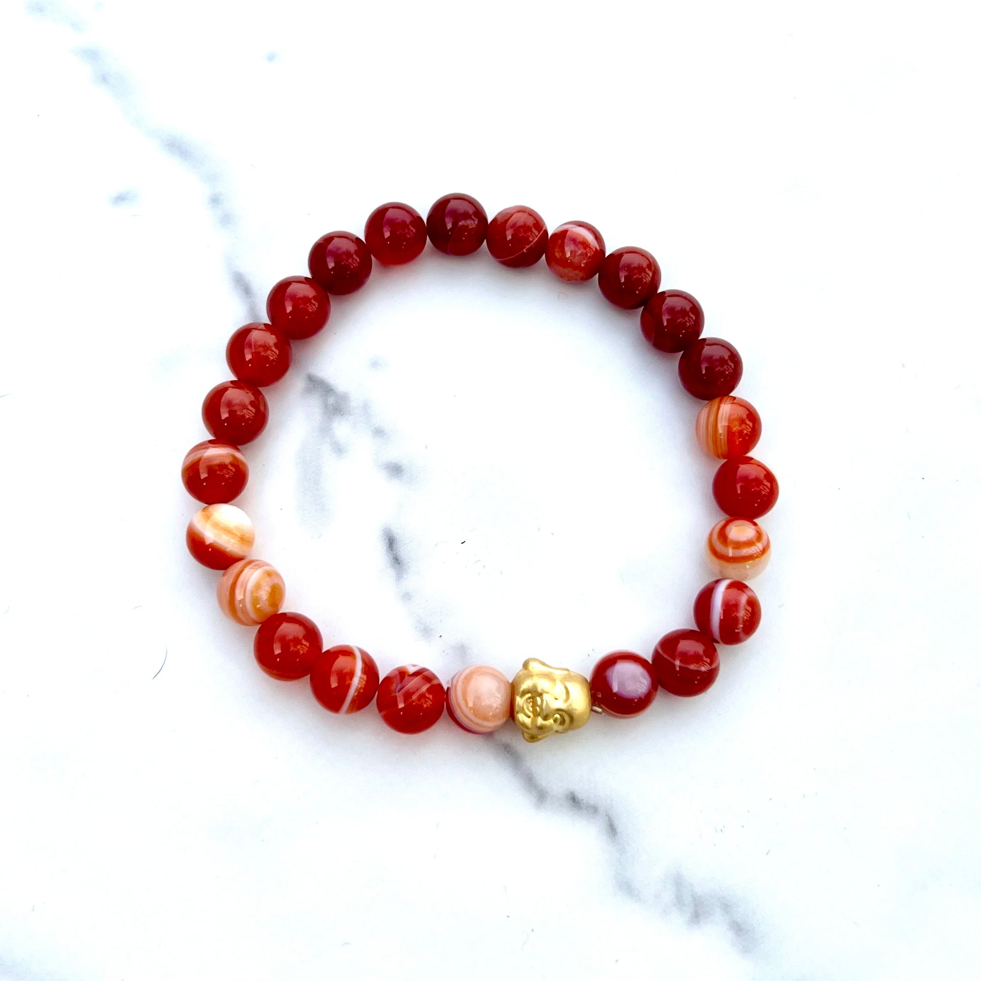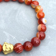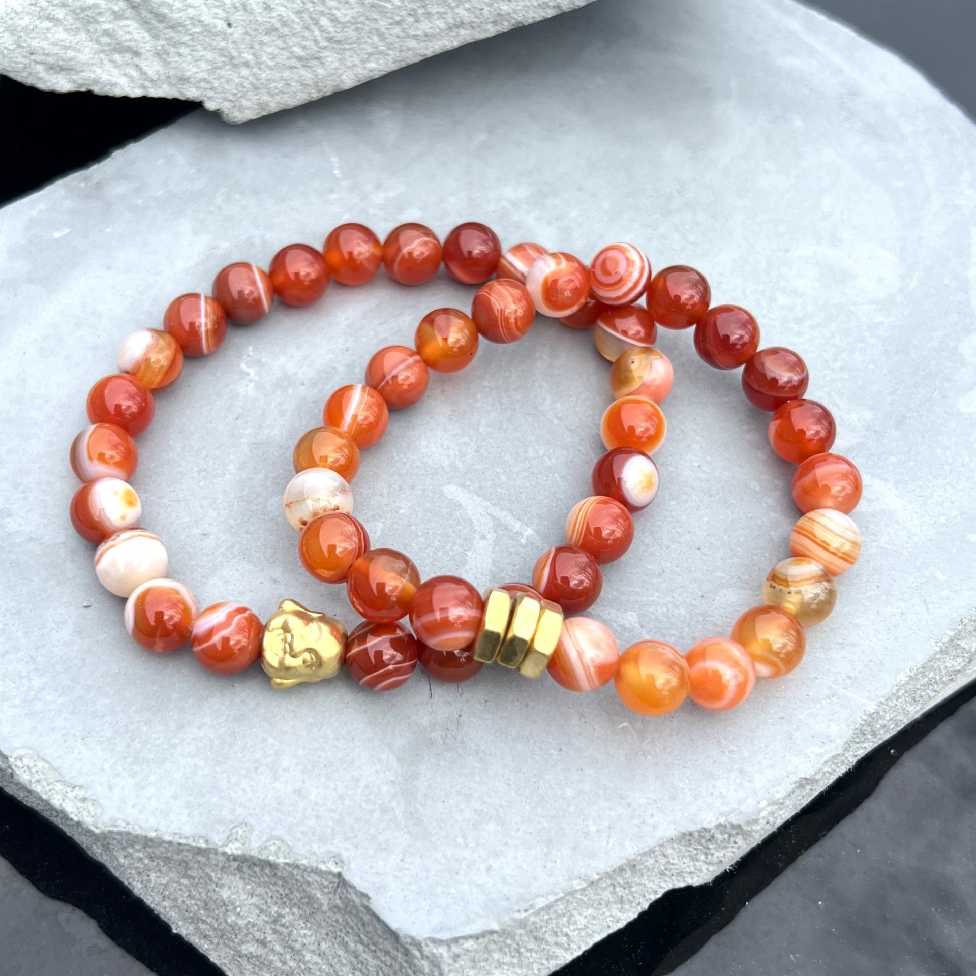 Our Carnelian Beaded Bracelet, a bold and energizing piece crafted with 8mm beads in rich orange-red tones. Designed for both men and women, this bracelet radiates vitality and purpose—whether worn solo or layered for a personalized stack. Choose between a gold Buddha or gold hex nuts as your focal bead to reflect your unique style.