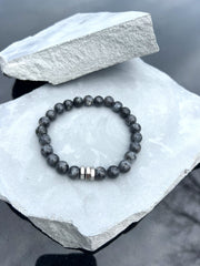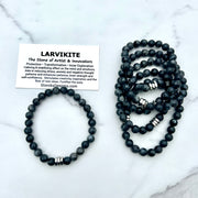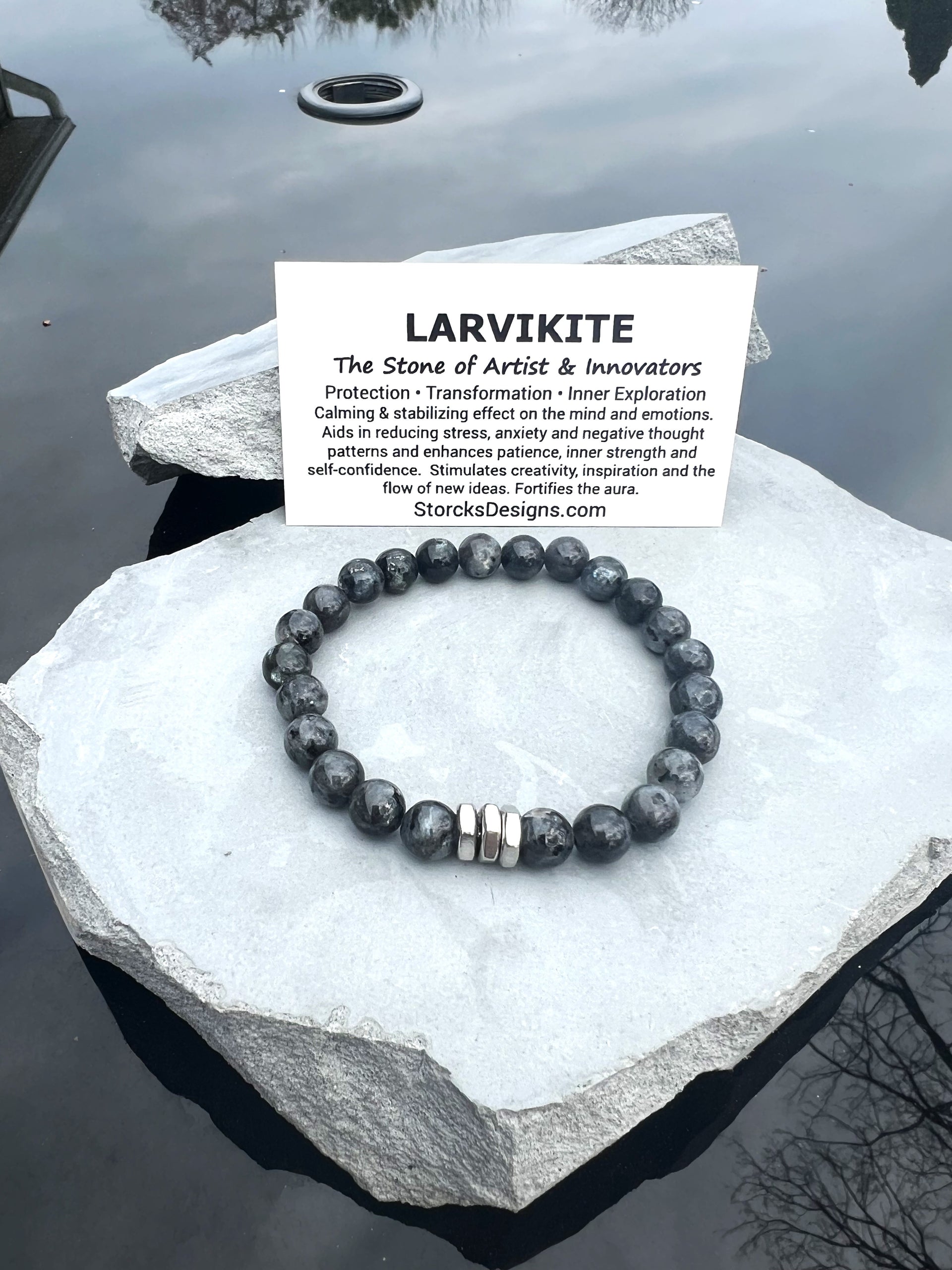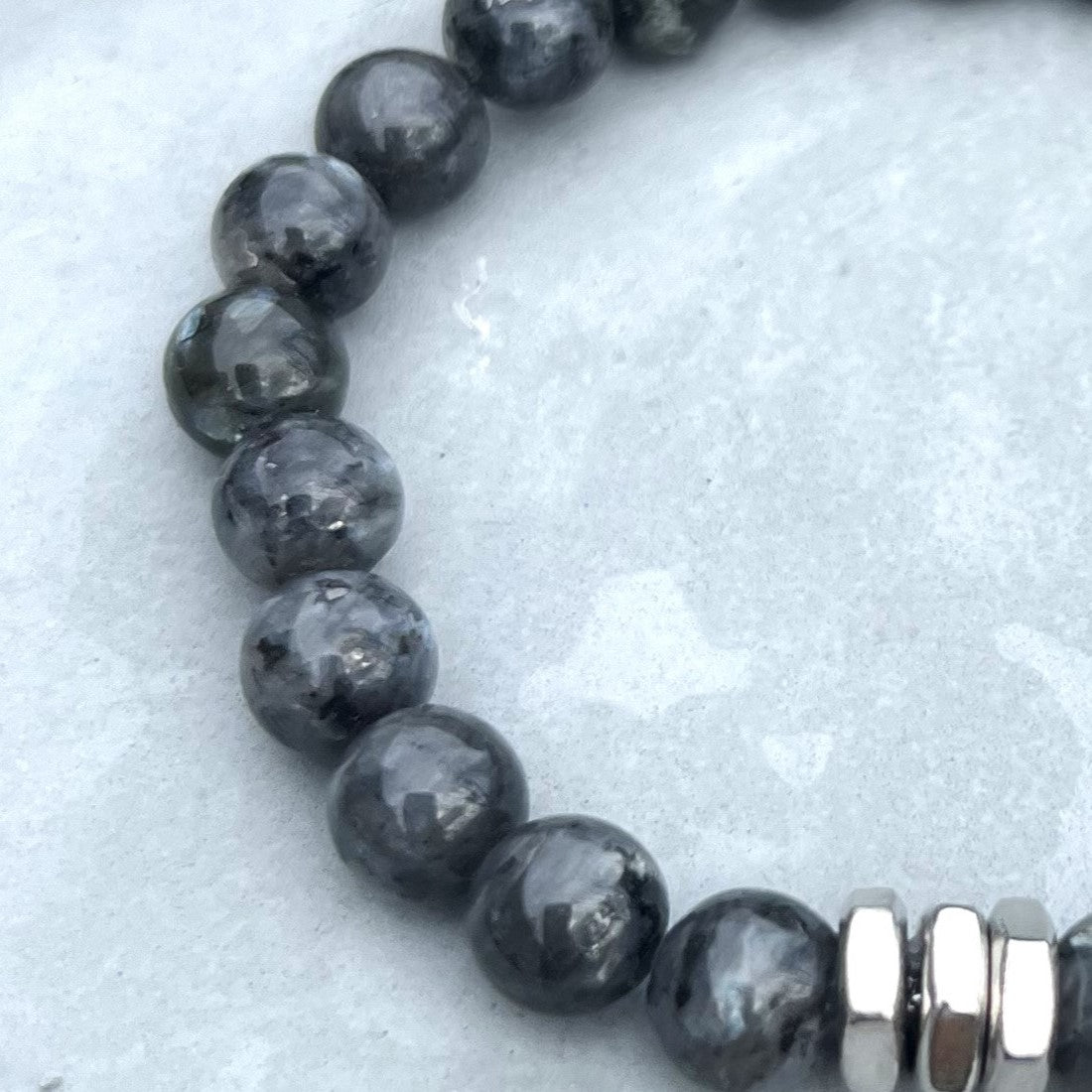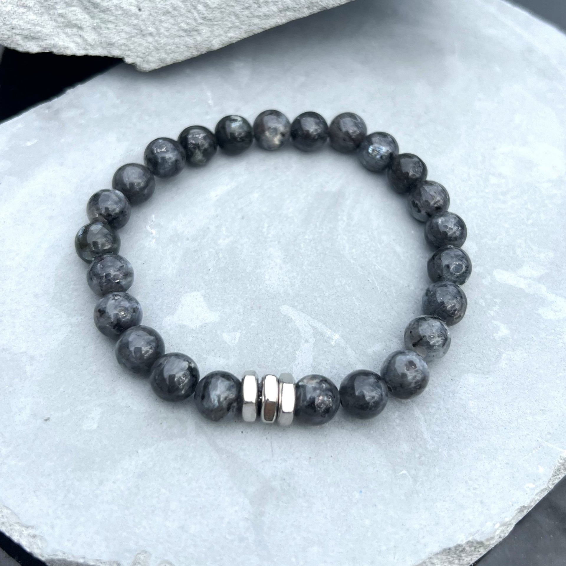 Hand-strung in small batches, our Larvikite Beaded Bracelet is a bold yet refined piece, designed to inspire creativity and confidence. Featuring 8mm stones and three stainless steel hex nut focal beads, this bracelet showcases a dark, shimmering base that reflects flashes of grey and blue—much like Labradorite—when caught in the light.