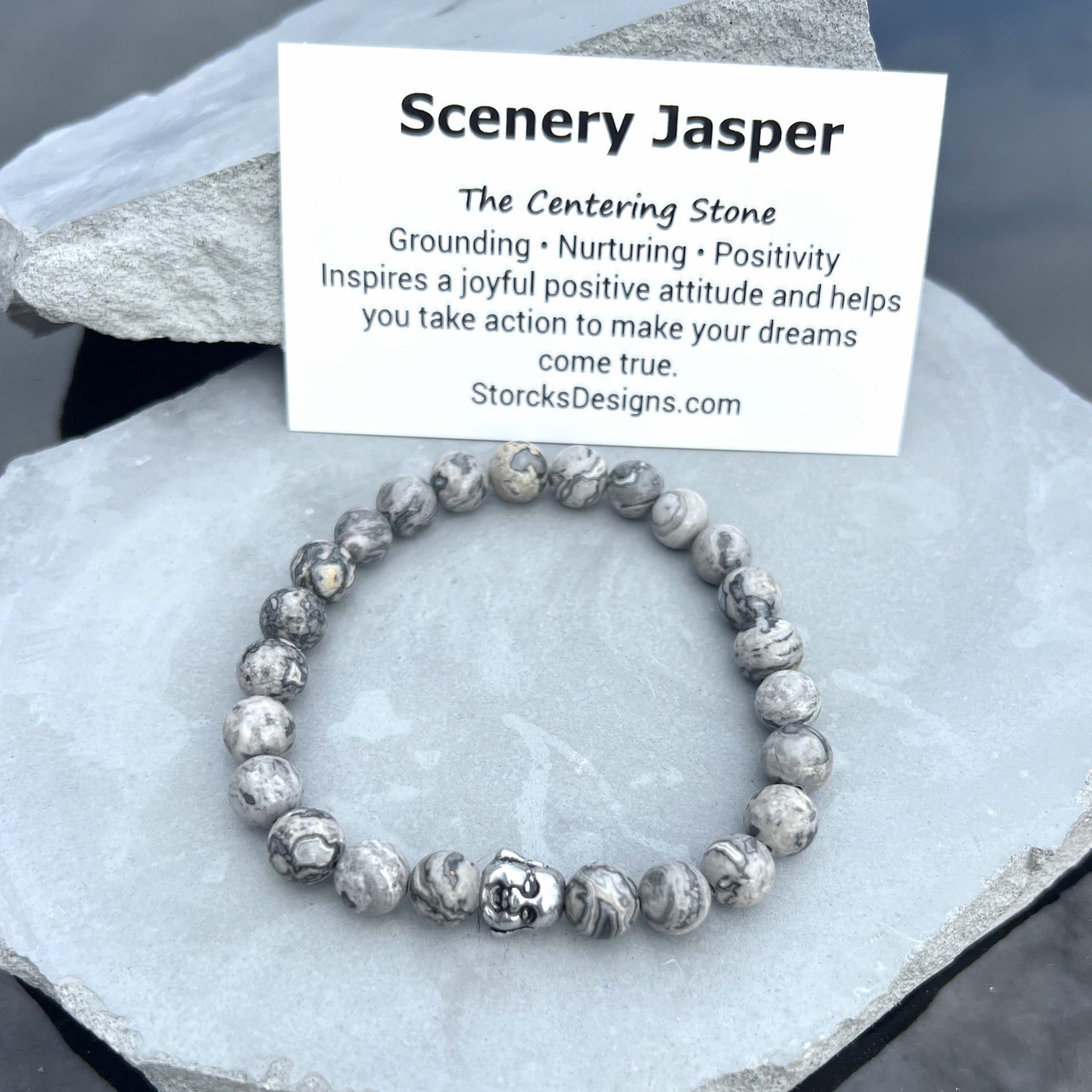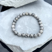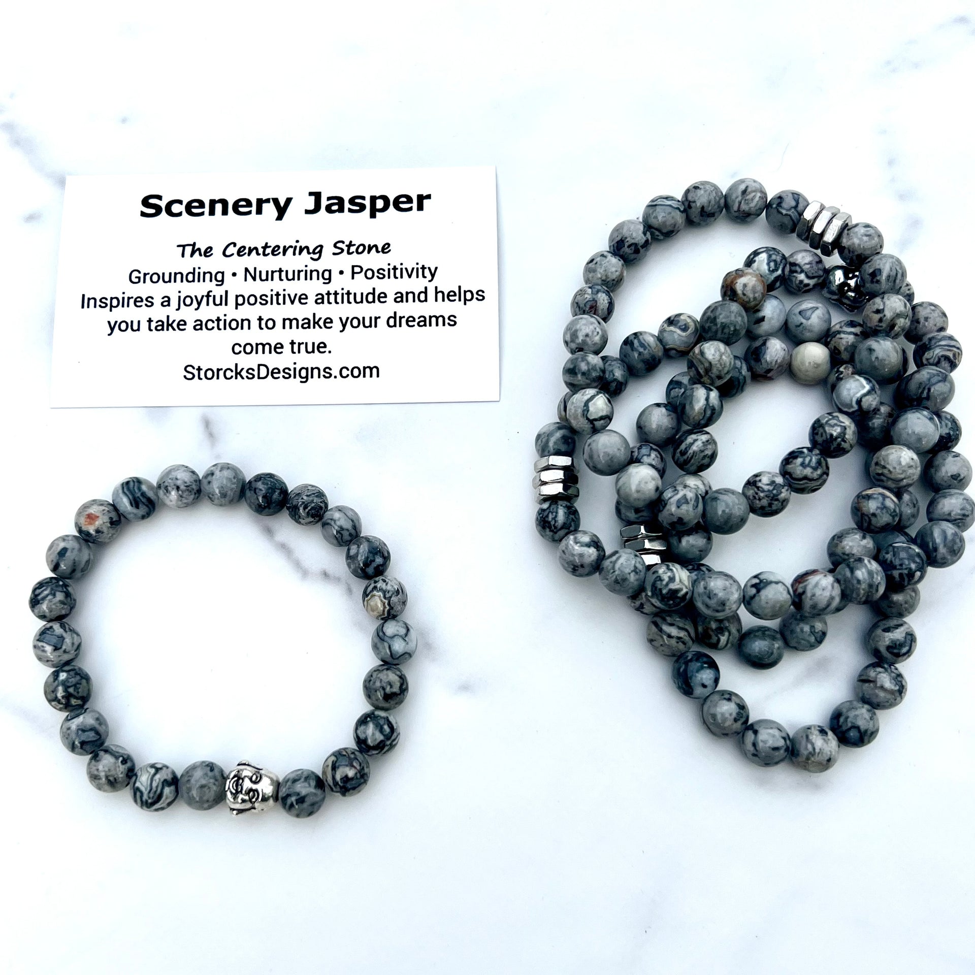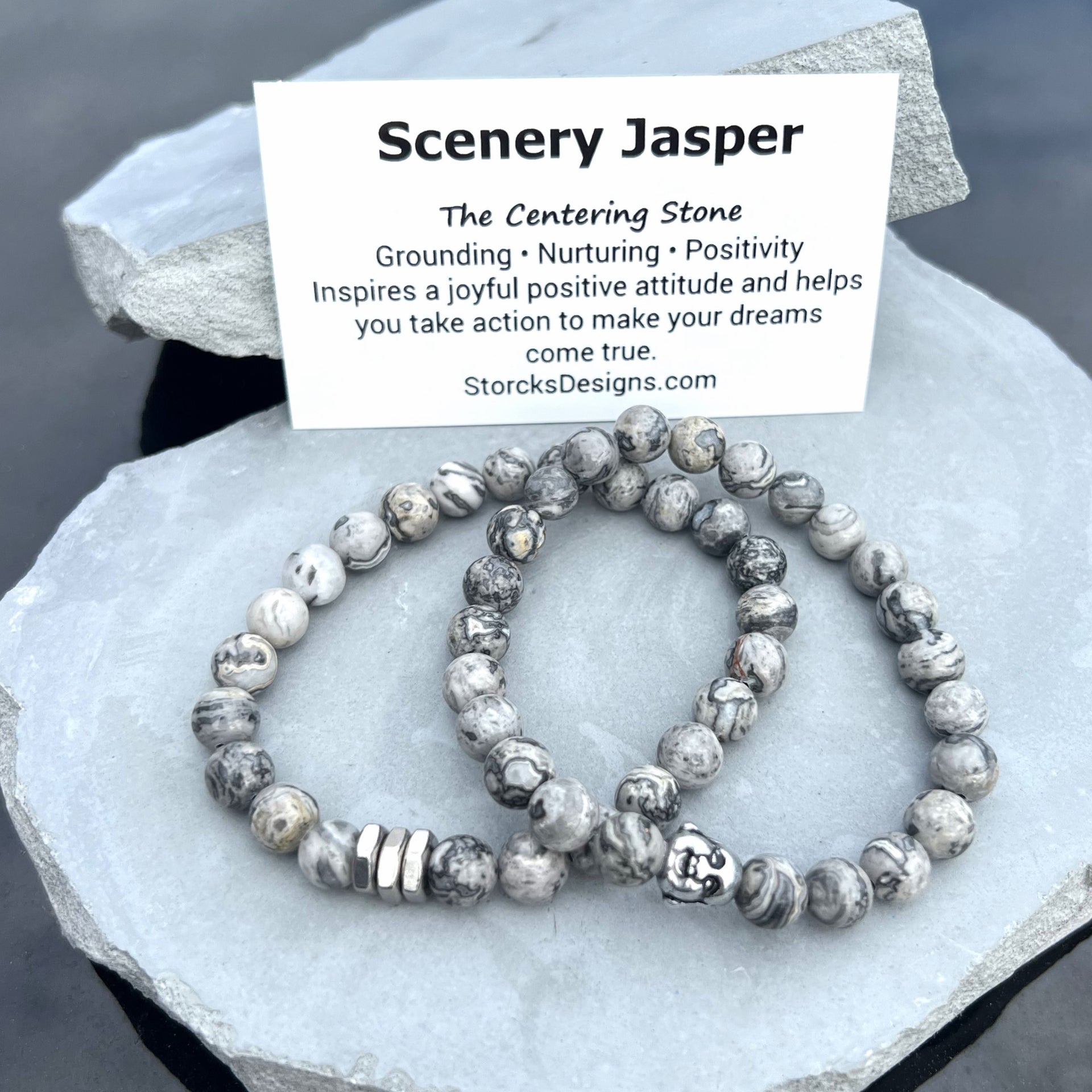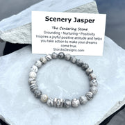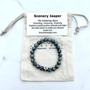 Hand-strung in small batches, our Scenery Jasper Beaded Bracelet brings together earthy tones and natural elegance—echoing the quiet strength of mountain landscapes and the salt-and-pepper charm of our beloved miniature schnauzer, Randy. Each 8mm bead features soft, grounding neutrals that blend seamlessly into any collection.