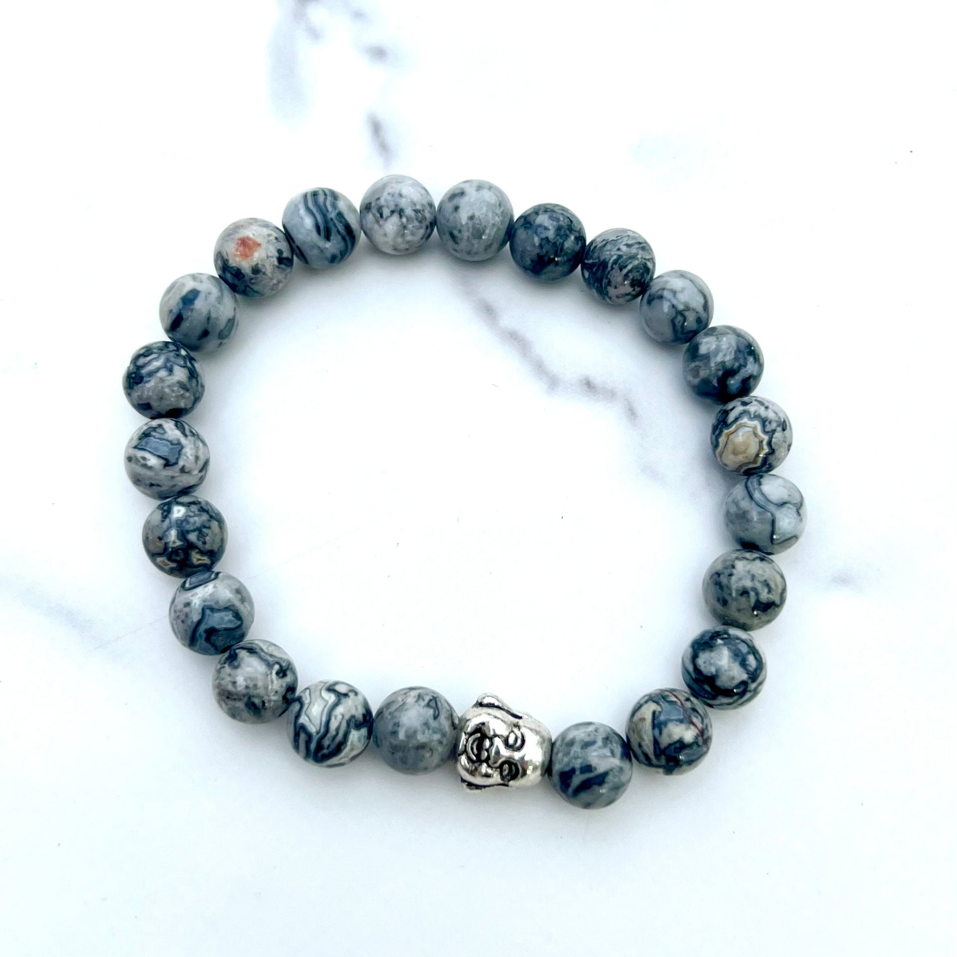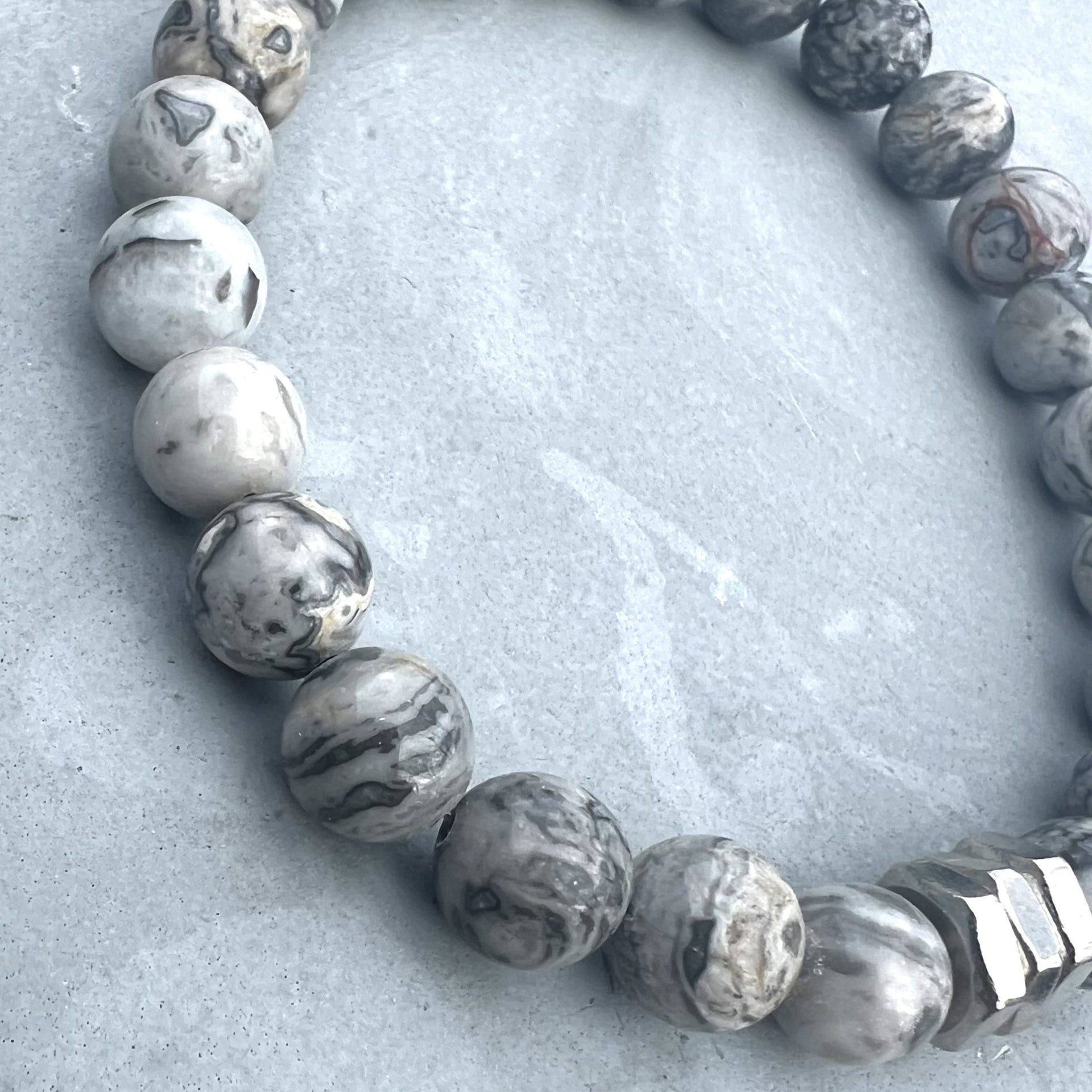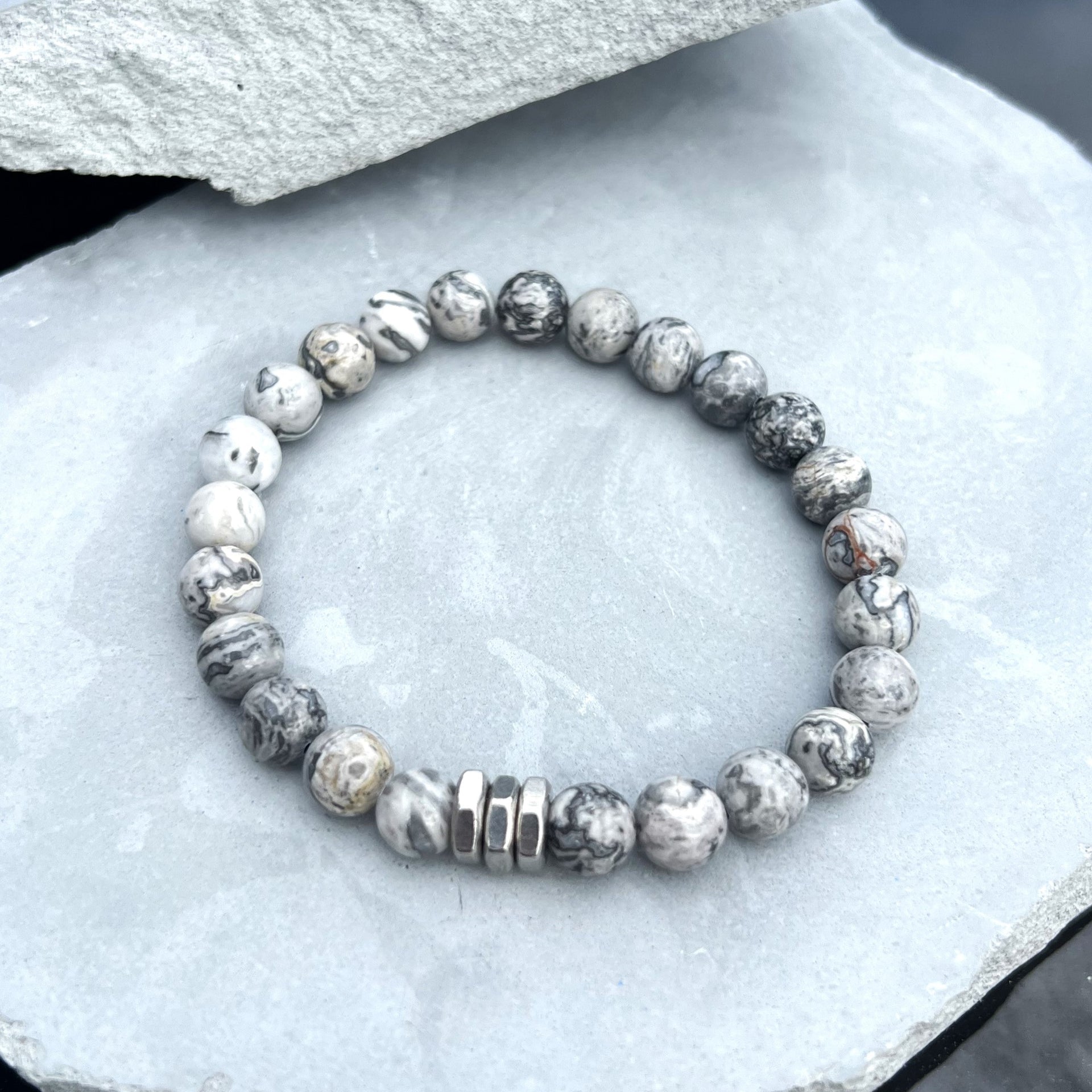 Hand-strung in small batches, our Scenery Jasper Beaded Bracelet brings together earthy tones and natural elegance—echoing the quiet strength of mountain landscapes and the salt-and-pepper charm of our beloved miniature schnauzer, Randy. Each 8mm bead features soft, grounding neutrals that blend seamlessly into any collection.