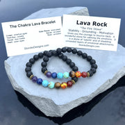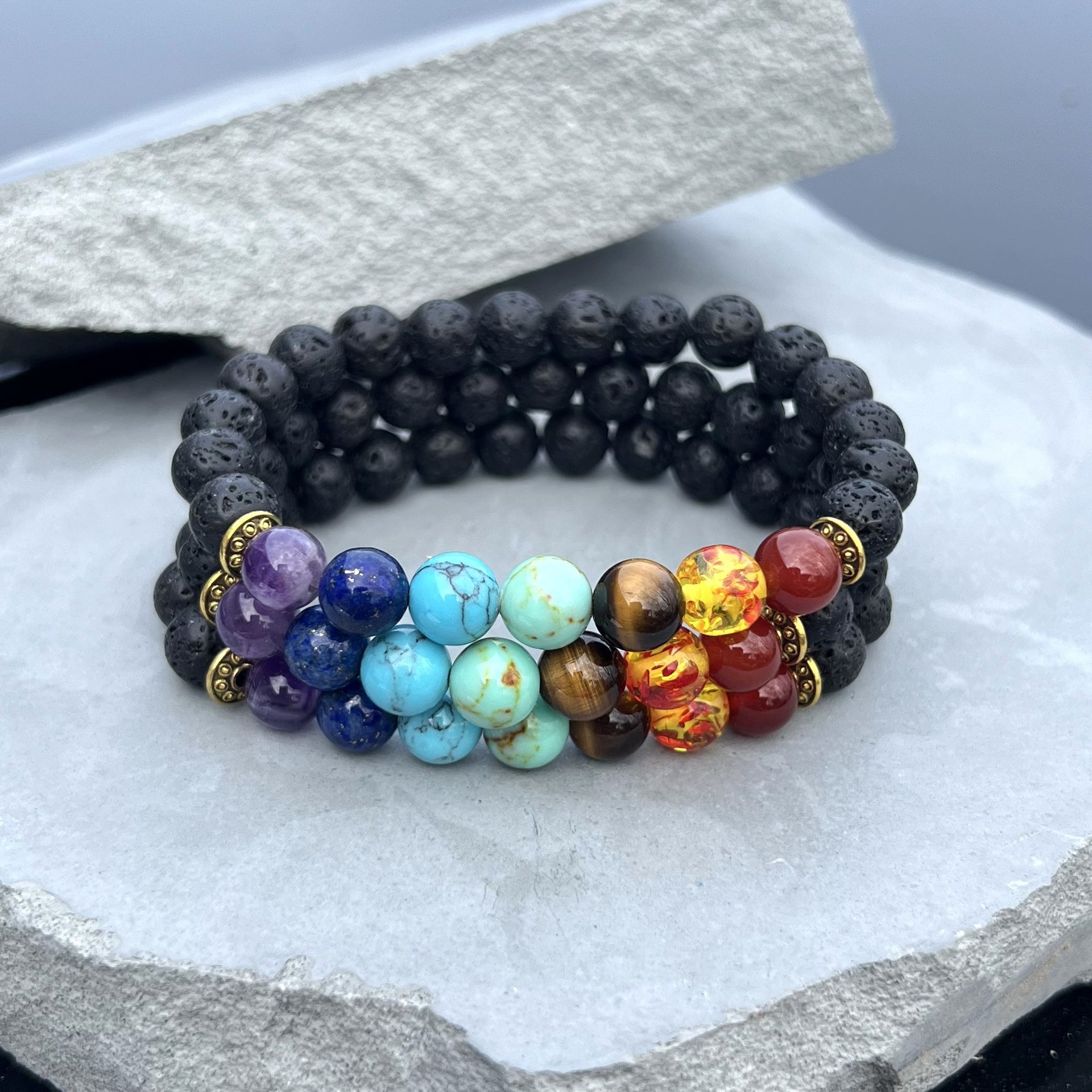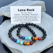 Each bracelet features seven vibrant stones representing the body’s energy centers: Amethyst Agate (crown), Sodalite (third eye), Blue Howlite (throat), Green Agate (heart), Wood Jasper (solar plexus), Red Jasper (sacral), and Carnelian (root). These powerful Chakra stones are framed by textured black lava rock beads, creating a striking visual contrast.