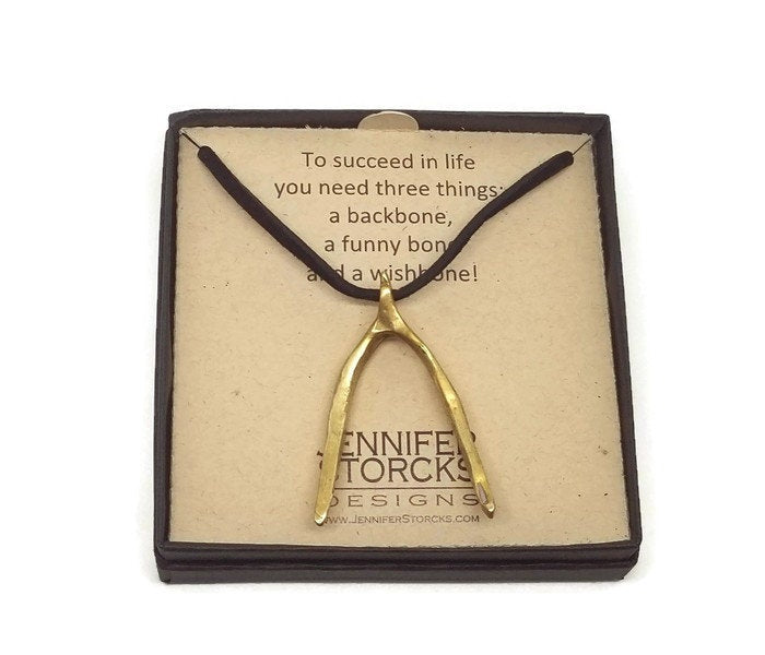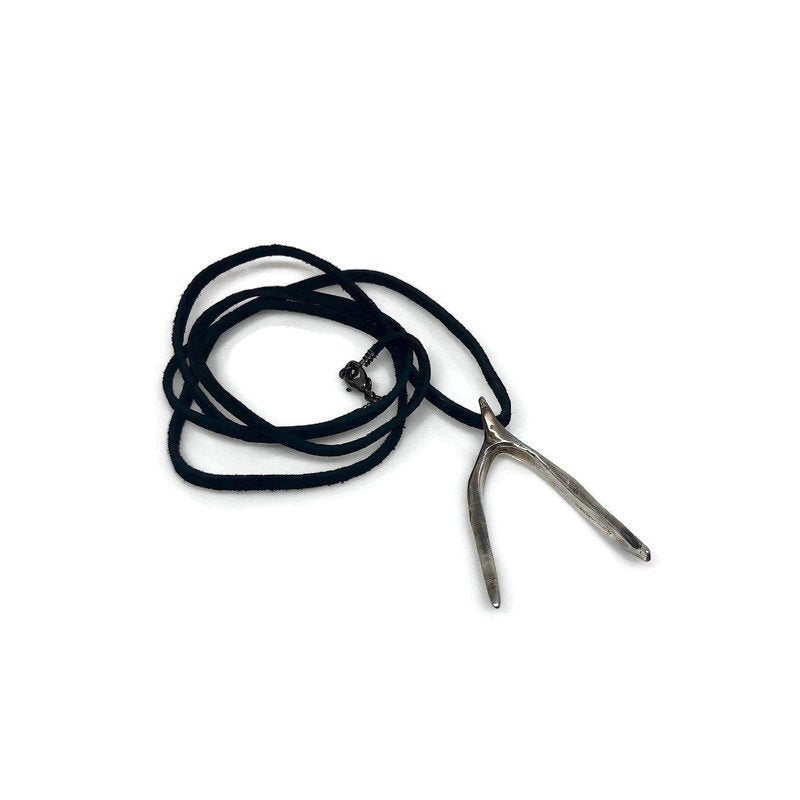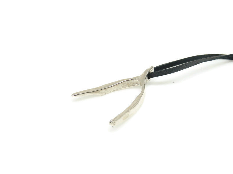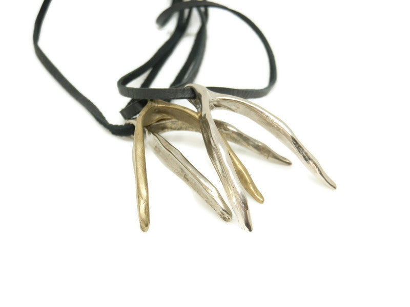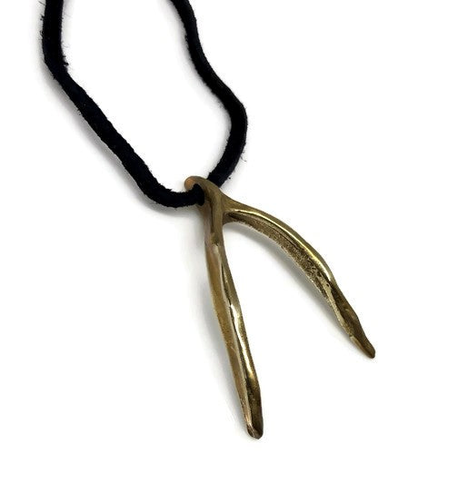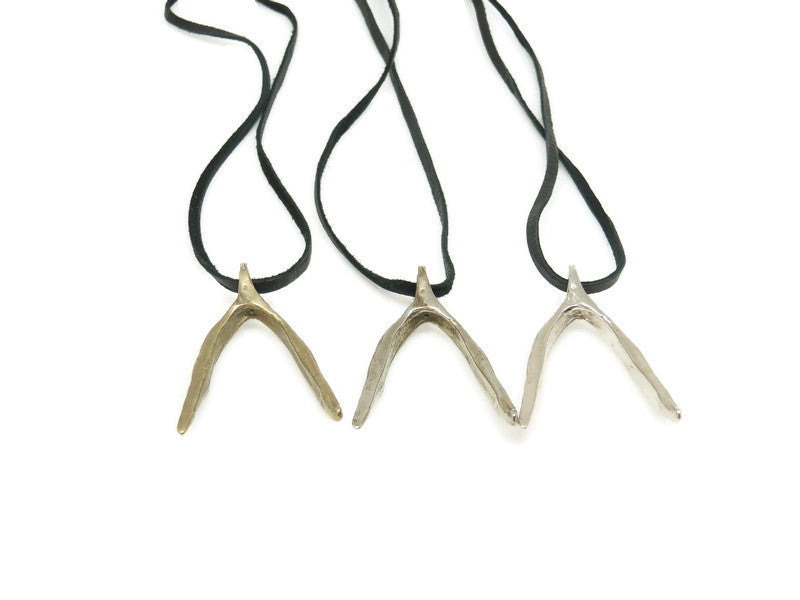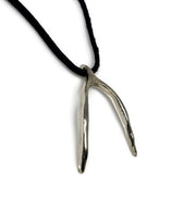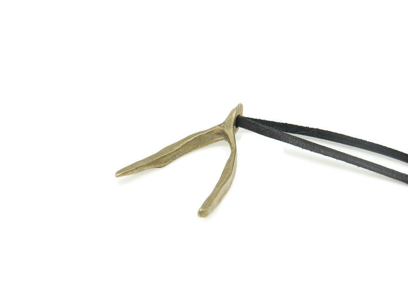 This isn't just a wishbone—it's the wishbone. Cast from a real chicken wishbone that I sculpted in wax and transformed into a mold, this necklace has real charm—literally. Available in brass, bronze (with a silver finish), or sterling silver, each one is strung on a rugged leather cord with a lobster clasp for easy, secure wear.