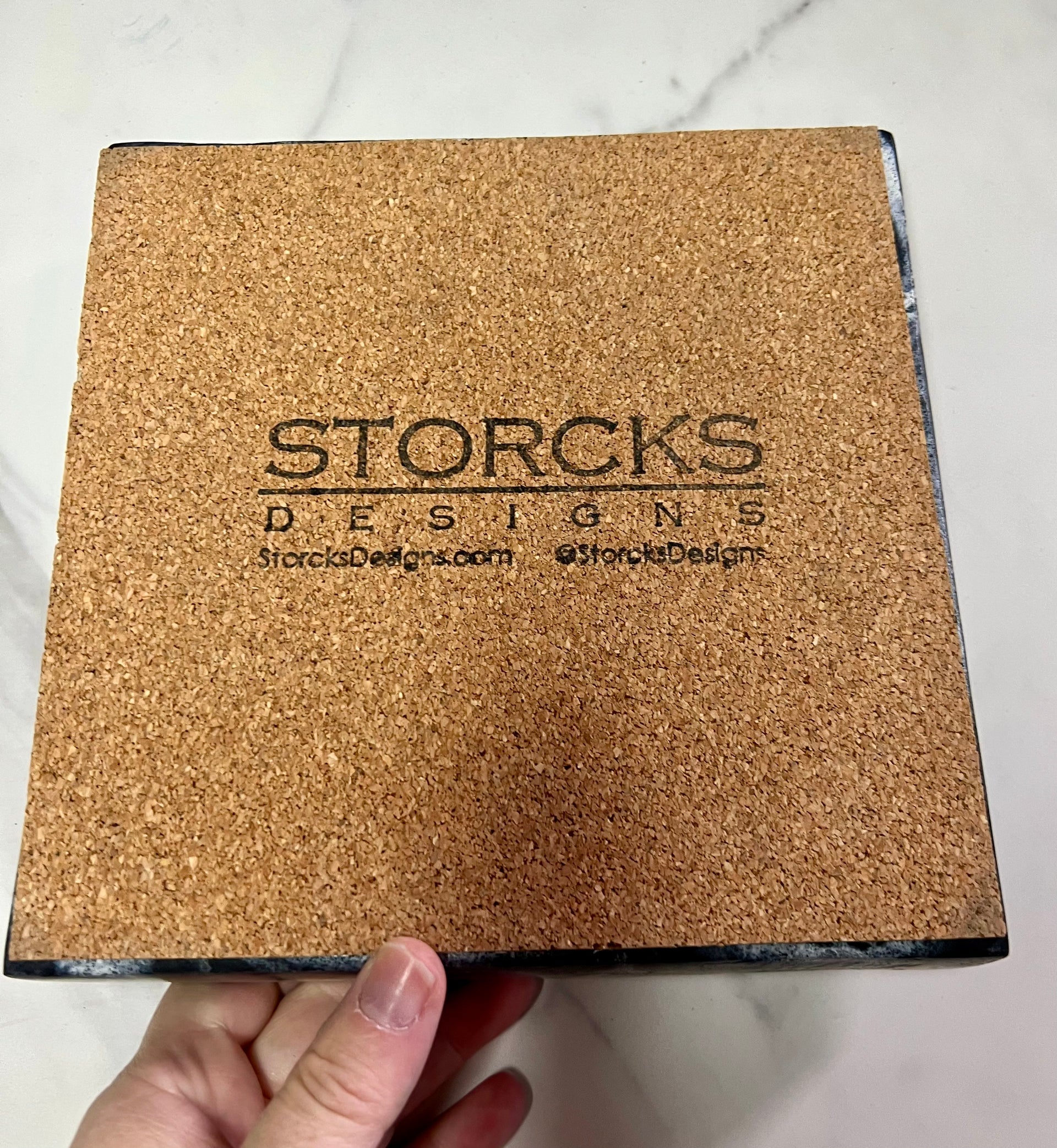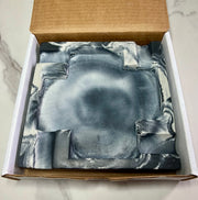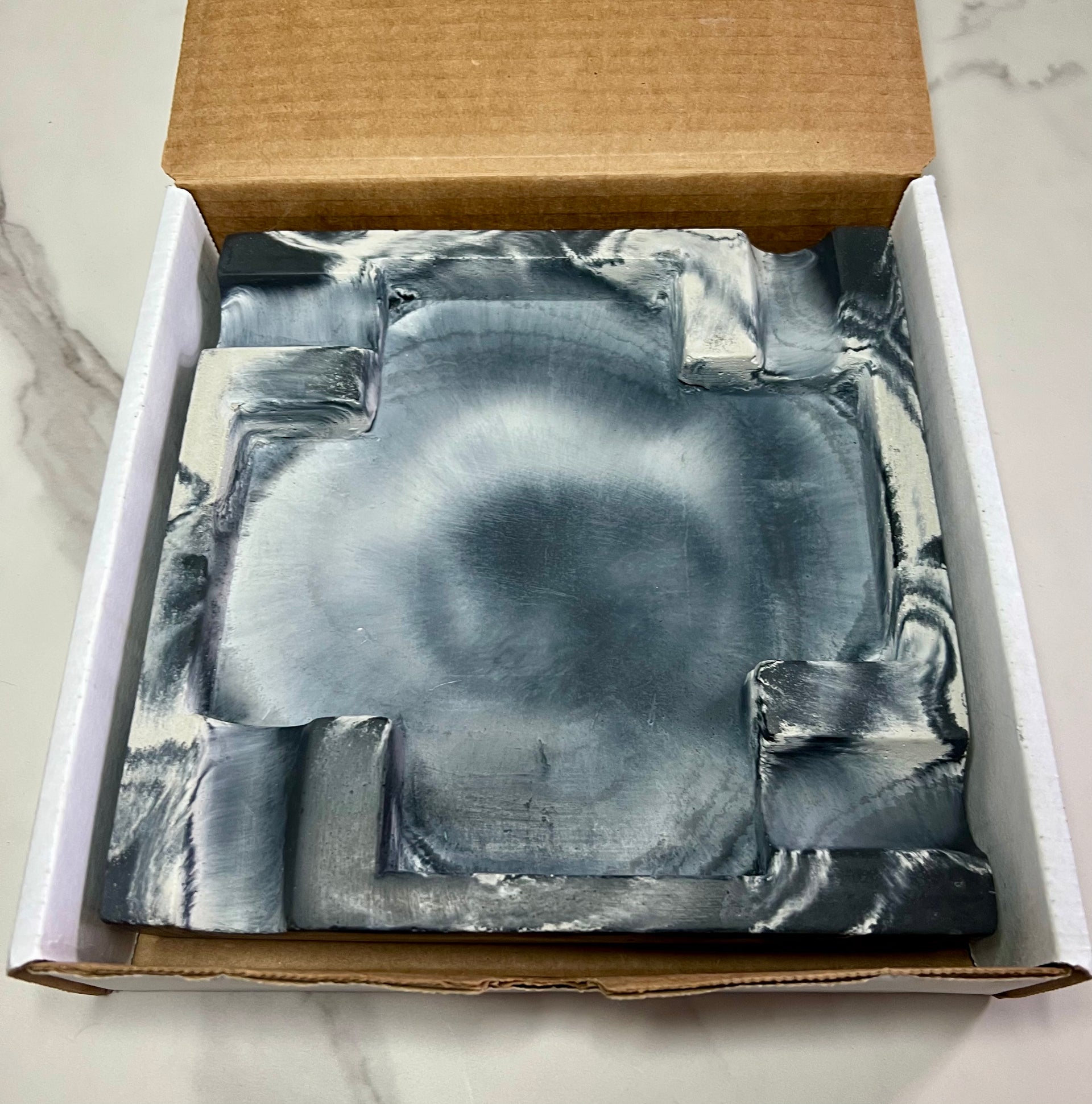 Our large cigar ashtray is hand dyed and poured in our garage on the Jersey Shore. This mold is our design. This one is black & white.